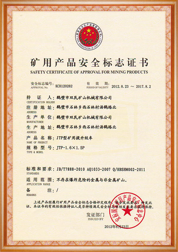 礦用產(chǎn)品安全標(biāo)志證書